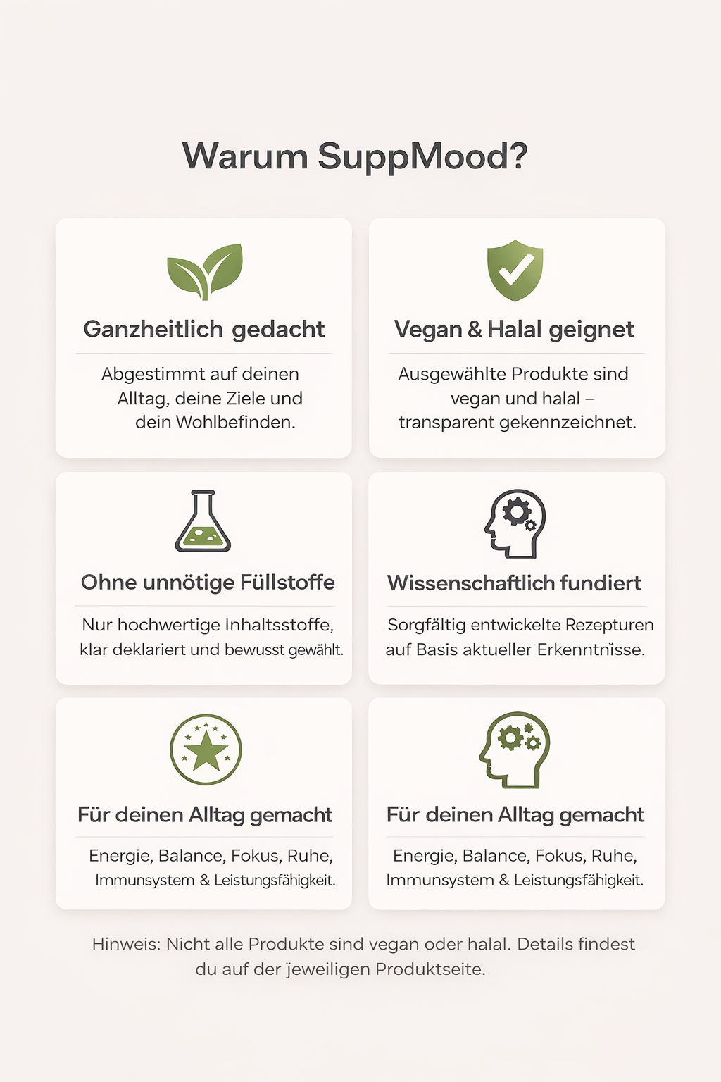 Unsere Supplements sind für die regelmäßige Einnahme im Alltag gedacht. Bei Unsicherheiten oder Vorerkrankungen empfehlen wir, vorab Rücksprache mit einer Fachperson zu halten.